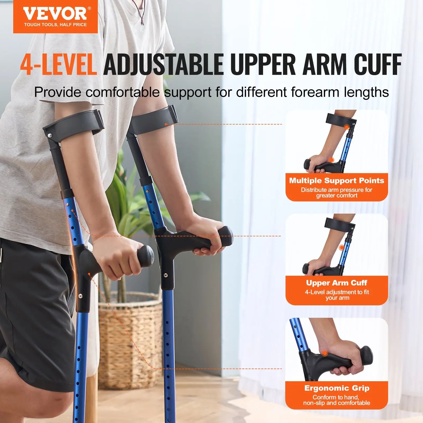 Multiple Adjustment, Perfect Fit: VEVOR forearm crutches feature 4-level adjustable upper arm cuff, providing comfortable fit for different forearm lengths. Combined with 11-level height adjustment, it suits users of varying heights, from 55.12″ to 70.87″